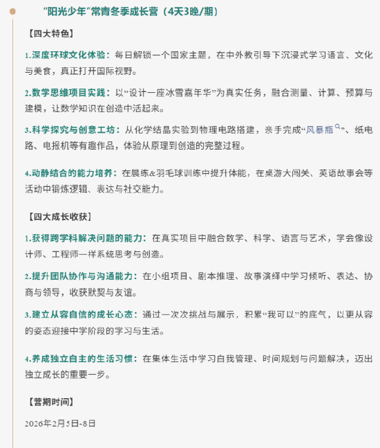 这个寒假,常青学校 “阳光少年”冬季成长营,专为这个充满好奇与潜能的年龄段,尤其是面临小升初重要转折的孩子,打造了一个集学术深度、实践趣味与成长陪伴于一体的沉浸式学习王国。