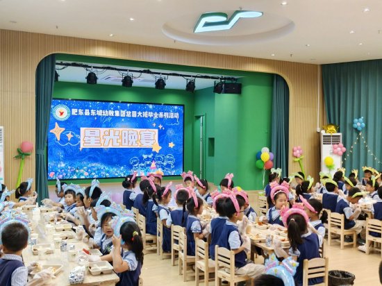 毕业典礼落幕,“星光晚宴”的欢乐随即而至。幼儿在餐台前自由挑选点心水果,围坐观看电影《哪吒》,光影流转间,食物的香甜与笑声交融成温馨画面。活动在《凤凰花开的路口》的合唱中渐入尾声,歌声载着不舍与祝福在夜色中轻轻回荡。