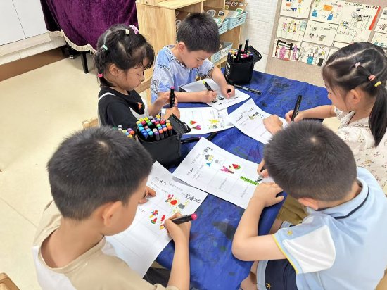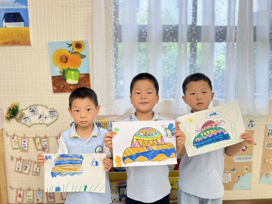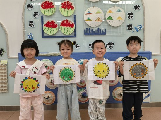 孩子们用鲜艳的颜色勾画出太阳公公可爱的模样:有的戴上了墨镜,有的在云朵上打招呼,有的甚至骑着光线滑梯“溜”下来……童心涂抹下的“夏至”,是一个调皮又温暖的早晨。