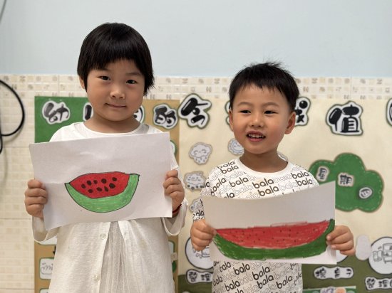 一块块甜甜的西瓜跃然纸上。孩子们用红绿相间的色彩表现出清凉与喜悦。夏天的清凉,在每一张笑脸中蔓延开来。