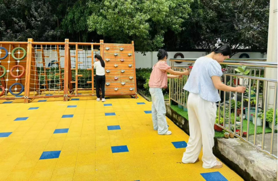 各班级教师深入教室、寝室、盥洗室等区域,对桌椅稳固性、电源插座封堵、等细节进行自查。针对暑期留园儿童的特殊需求,教师们重点检查了空调、风扇等降温设备的运行情况,并清理了教室角落的杂物,消除蚊虫滋生隐患。