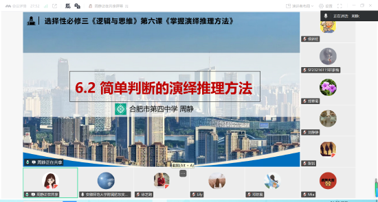 在课例展示环节,合肥一六八陶冲湖中学徐芝路老师执教初中课题《文明有礼》,合肥市第四中学周静老师执教高中课题《简单判断的演绎推理方法》。两位教师均基于“在场思政”教学主张,以“三在·三场”为核心理念,依托“三·三一”教学模式,通过创设真实情境、设计思辨性问题,引导学生开展深度思考与主动建构,实现从知识学习向素养提升的有效转化。