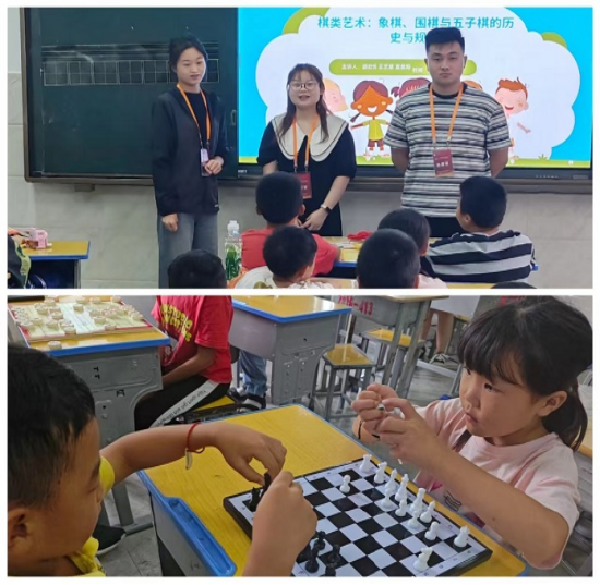 中国的“棋文化”历史悠久,源远流长。棋艺班专门为小学生开设,课程包括象棋、围棋等传统棋艺,通过学习和练习各种棋类游戏,培养孩子们对棋艺的兴趣,帮助孩子们提高专注力、思维能力和逻辑推理能力,使他们逐渐养成良好的行为习惯、生活习惯和科学的思维方法。支教团成员胡欣悦说:“在布置棋局和思考对策中,孩子们逐步学会了用科学的方法看问题、想问题。在对弈中,孩子们热情高涨、积极参与,享受不断成长的过程和乐趣。”