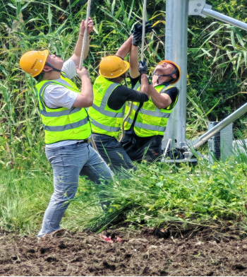 近日,在五河县沱湖北岸防洪坝旁,40米高的铁塔上,安徽移动蚌埠分公司工程施工人员全力推进合新高铁基站最后设备吊装。随着这一关键节点完成,合新高铁五河段 38 公里高铁沿线的37座基站全部安装到位。“跨湖低洼地势给信号覆盖带来大挑战,我们联合多方攻坚,不仅攻克难题,还比计划提前三个月完工。” 项目经理张小光说。
