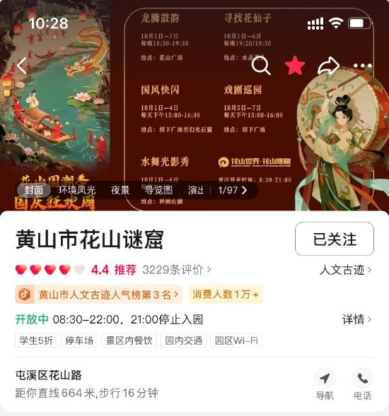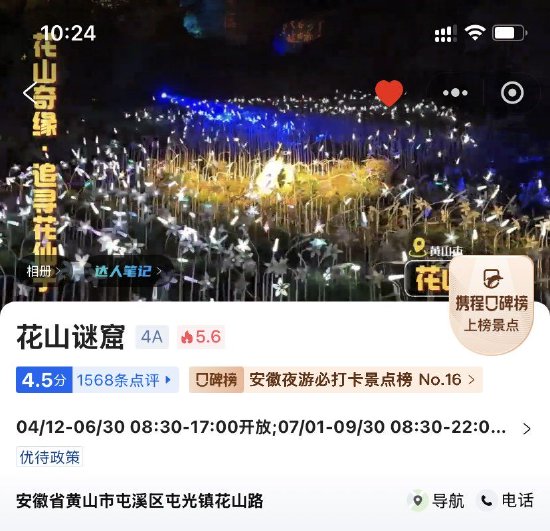 景区夜游实力“出圈”,神秘石窟与光影艺术交织的夜游场景成为“出片”胜地,社交媒体平台上“花山国潮季”等话题持续升温,景区成功上榜携程口碑榜“安徽夜游必打卡景点”、抖音黄山市人文古迹人气榜第三名。