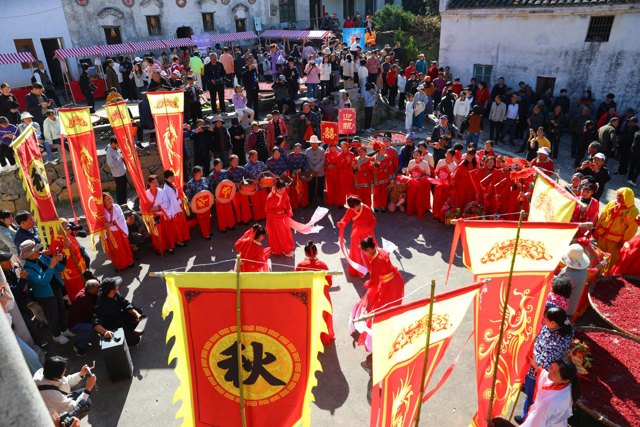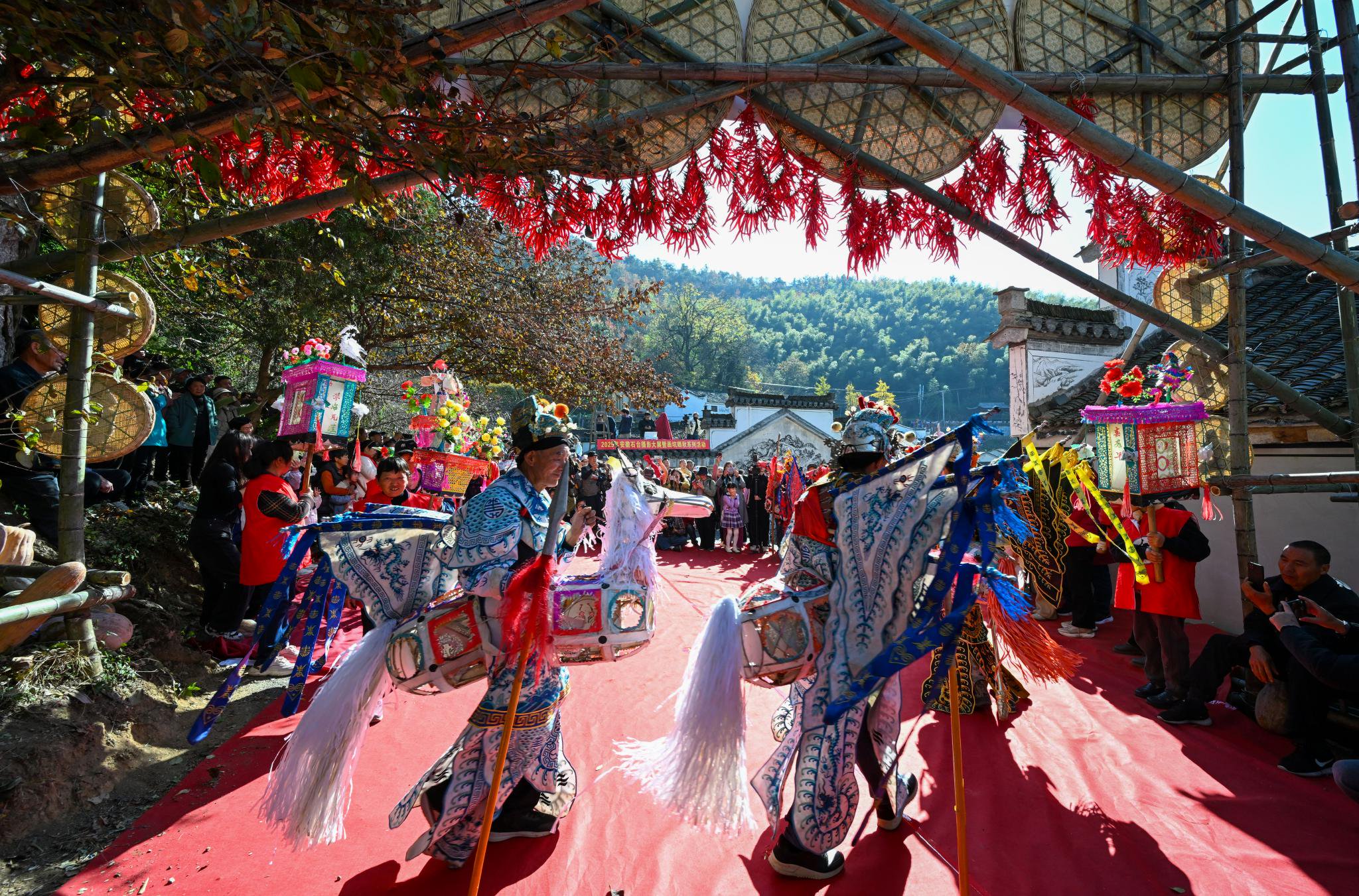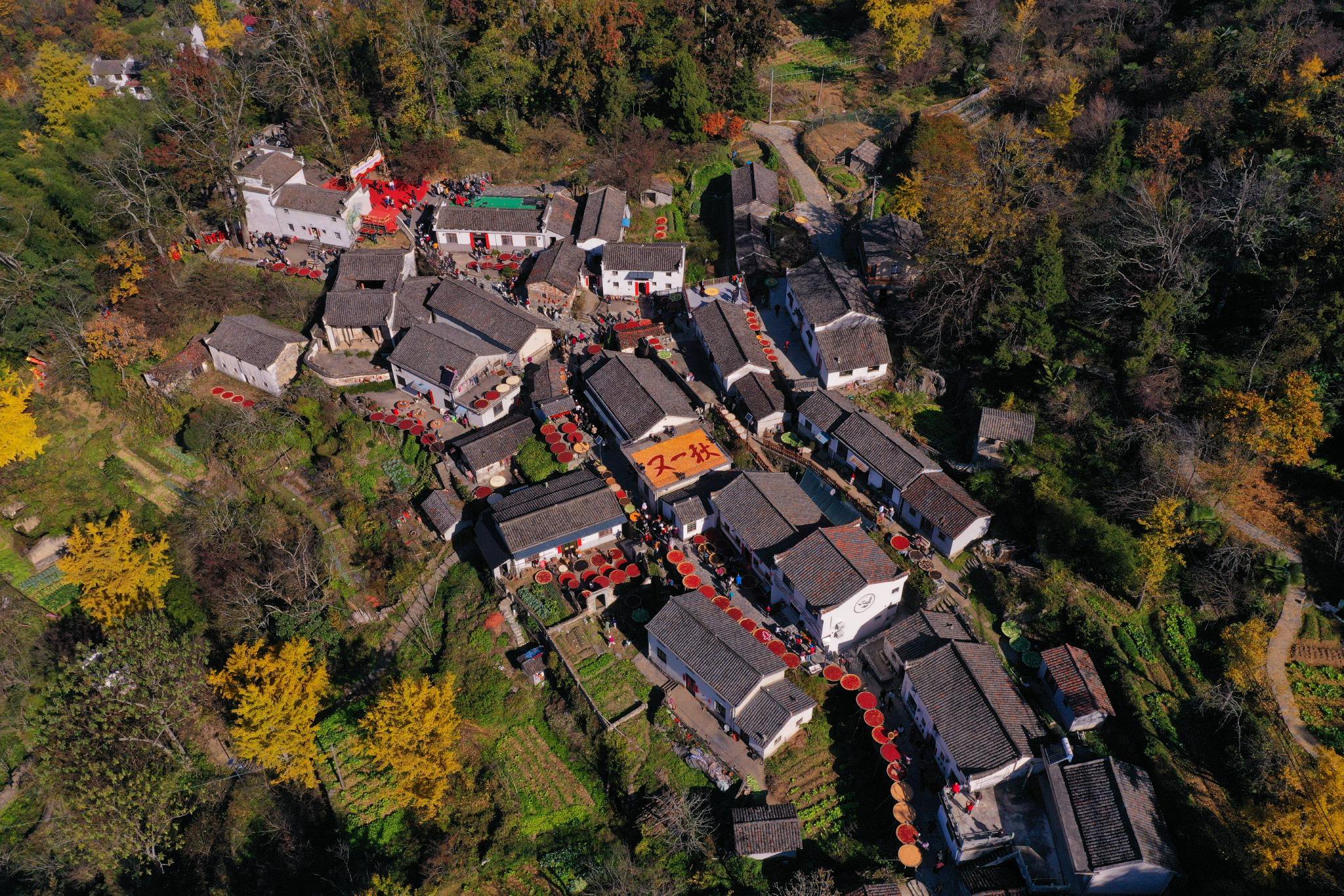 活动当天,整个山巅上徽派村落满是丰收景致,屋顶、晒架上,山茱萸如火焰染红屋檐,红辣椒串垂挂院墙,黄玉米堆泛着金光,村民还用簸箕将作物摆成“又一秋”字样与花朵图案。伴随着清脆的锣响起,整个山村瞬间热闹起来,非遗马灯展演的队伍率先登场,穿着彩色戏服的村民们踩着锣鼓节拍,举着造型精致的马灯在古村里巡游。整村宛如绚丽油画,尽显皖南山区丰收之美。