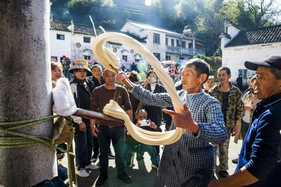 村口老手艺体验区热闹非凡。拉糖师傅臂腕起落,莹白米糖拉成银丝,他笑称米糖从九月底卖到腊月二十八,供不应求;豆腐坊内石磨“咕噜” 转动,豆浆混着炊烟飘出乡愁味;村民围木臼打糍粑的 “砰砰”声,与马灯戏锣鼓声相和。抛绣球婚俗区更引游客参与,接到绣球的游客依传统作揖,池州游客许光银感慨:“一来到这里,就感受到画坑晒秋的浓浓乡土生活气息,还体验了各种老手艺,太有趣!”手机里存满素材待分享。